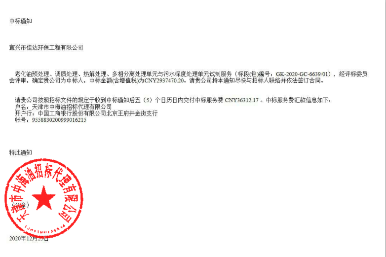 中標中海油老化油預處理相關項目  2021/3/10